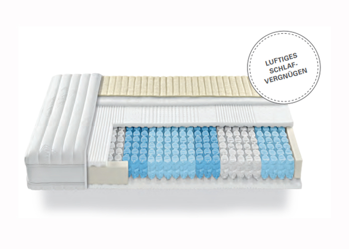Das Meisterstück - mit den Vorzügen von Clima und Vita. Die TBS-Federn sorgen für optimale Durchlüftung der Matratzen. Zusätzliche Oberflächenschnitte optimieren die Luftzirkulation und Druckentlastung. Zudem schafft die einzigartige Wings Technologie nachweislich einen optimalen Schlafkomfort in allen Liegepositionen.
